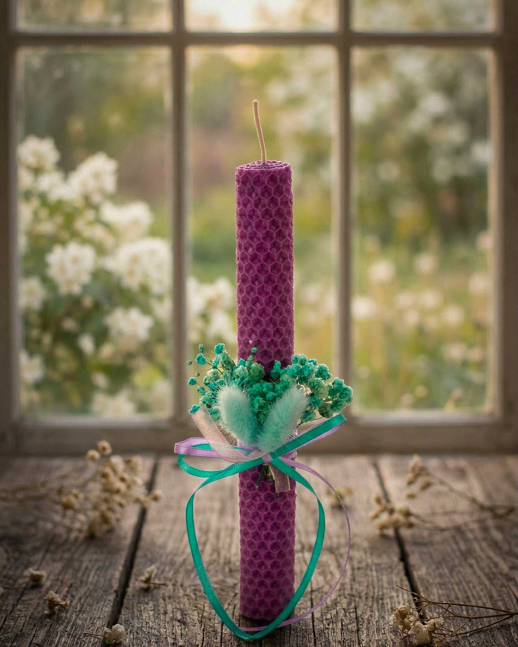 Χειροποίητη Πασχαλινή Λαμπάδα από Μελισσοκέρι με Μπουκέτο Αποξηραμένων Λουλουδιών