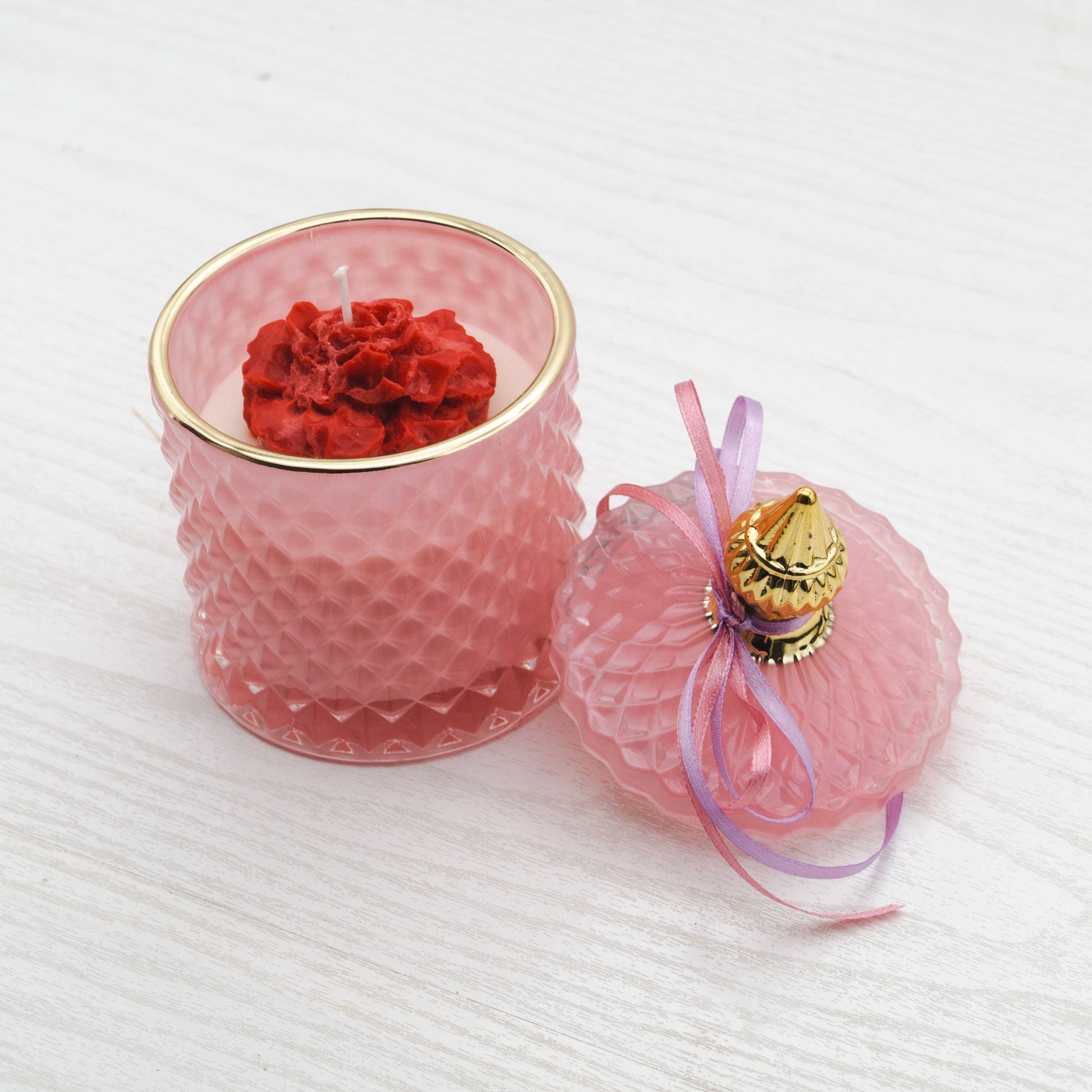 Γιορτάστε την αγάπη με αυτό το κομψό κερί σόγιας. Χειροποίητο με μυρωδιά Rose & Champagne και διακοσμημένο με κερί σε σχήμα τριαντάφυλλο.