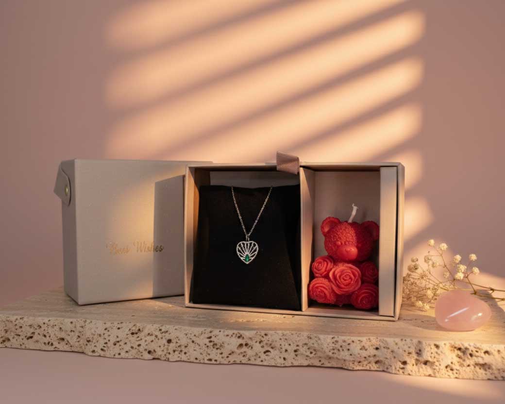 Γιορτάστε την αγάπη με αυτό το κομψό σετ δώρου που περιλαμβάνει ένα κολιέ από ανοξείδωτο ατσάλι και ένα χειροποίητο αρωματικό κερί σε σχήμα αρκουδάκι στολισμένο με λεπτά τριαντάφυλλα. Όμορφα συσκευασμένο στο χαρακτηριστικό μας κουτί, είναι το τέλειο ρομαντικό δώρο για να κάνετε κάποιον να νιώσει πραγματικά ξεχωριστός.